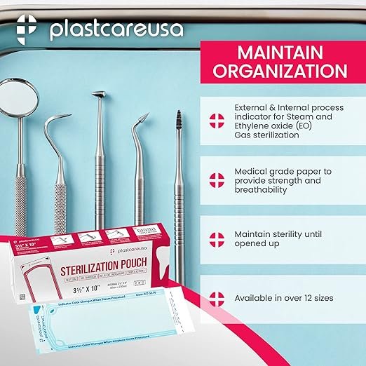 - BULK SELF-STERILIZATION BAGS: PlastCare USA provides 1 box of 200 pouches. These sterilizing bags keep teeth cleaning instruments and other dental tools sterilized until their next use. Keep your dental office or lab clean and sterile with these pouches.